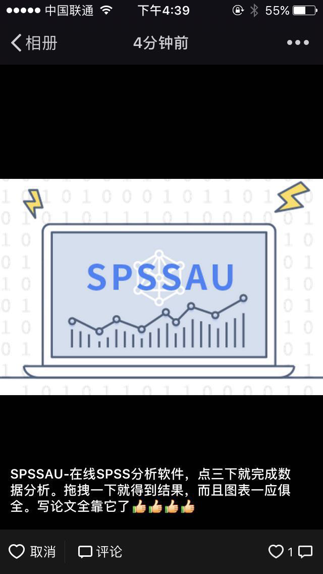 1.将SPSSAU使用体验分享至微信朋友圈,获得10个点赞后,进行截图