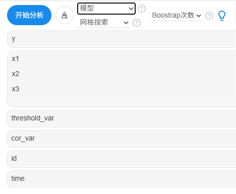 自变量X框可放入多项,如果实际研究中并没有则不放入。门槛变量需要放入,核心解释变量为1项,当前数据是面板格式,因而放入id和time到对应框中。