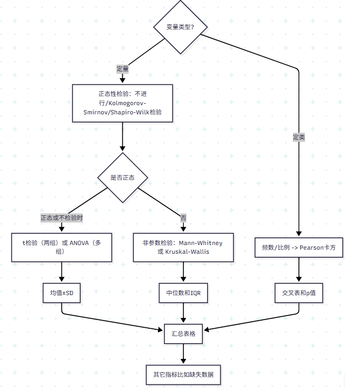 SPSSAU中进行基线分析时,其判断的逻辑如下图: