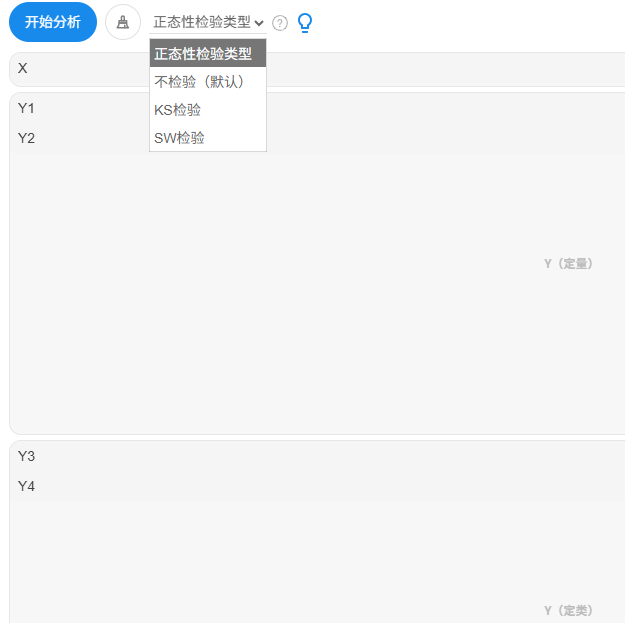 分别放入X,定量项或者定类框分别放入Y,正态性检验类型上,默认为不检验正态性,即针对定量数据直接使用参数检验;如果选中KS检验/SW检验,SPSSAU会自动结合KS或SW检验并且以p 值是否大于0.05作为正态性判断标准,如果p 值>0.05则正态,此时使用参数检验,反之p 值<=0.05则不正态,此时使用非参数检验。