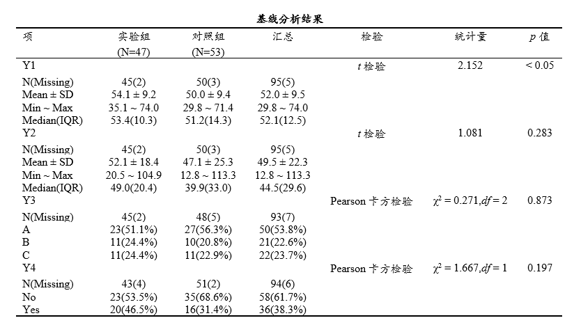 基线分析(Baseline),其用于比较研究各组在干预前(基线)的人口学与临床特征,判断各组是否平衡;为后续因果推断或调整分析提供依据。基线分析通常用于随机对照试验(RCT)、队列研究、分组干预前描述性比较。