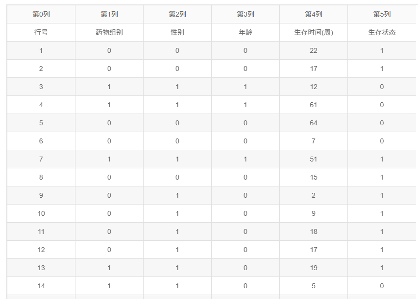 原始数据如下图,下图中药物组别0表示传统治疗,1表示新式药物;性别0表示女性,1表示男性;年龄0表示50以下,1表示50及以上;生存时间以周为单位;生存状态1表示死亡,0表示生存。