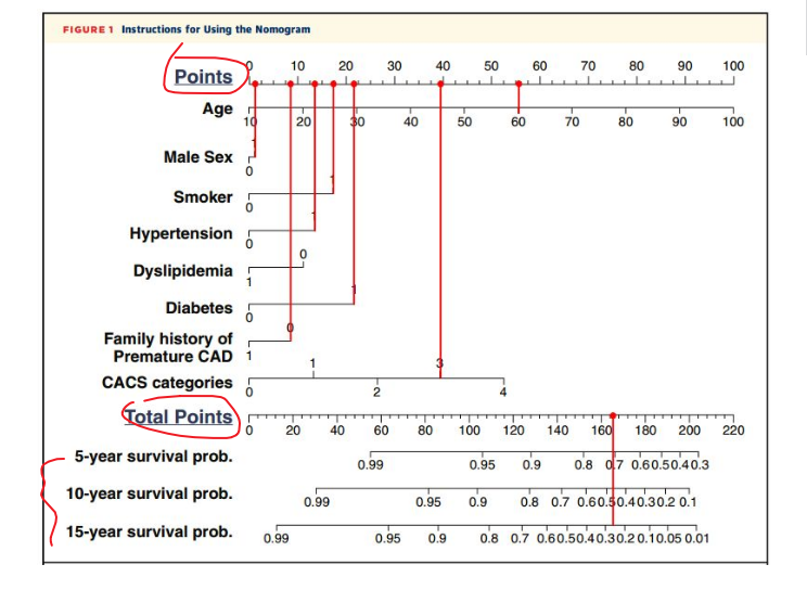 比如上图是cox回归之后,可以得到很多个X,比如age, male sex, smoker, hypertension, dyslipidemia, diabeter…等的回归系数。按cox回归的原理来看,这些X的具体取值(假定其它不变化时)时会对应有一个Points即第1行的数字。比如Age为60的时候大概可对应着55,Smoker为1的时候对应18左右。每个变量的具体值时可对应一个Points,然后全部加起来就有个total points去对应。