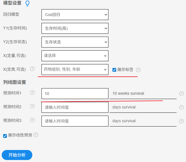 关于‘列线图设置’,预测时间点共包括3个时间点,完全不填写或者填写1/2/3个预测时间点均可,另时间点有着单位,比如本案例的单位为‘周’,那么比如希望研究10周的生存概率,那么就填入数字10,后面内容为比如“10 weeks survival”。