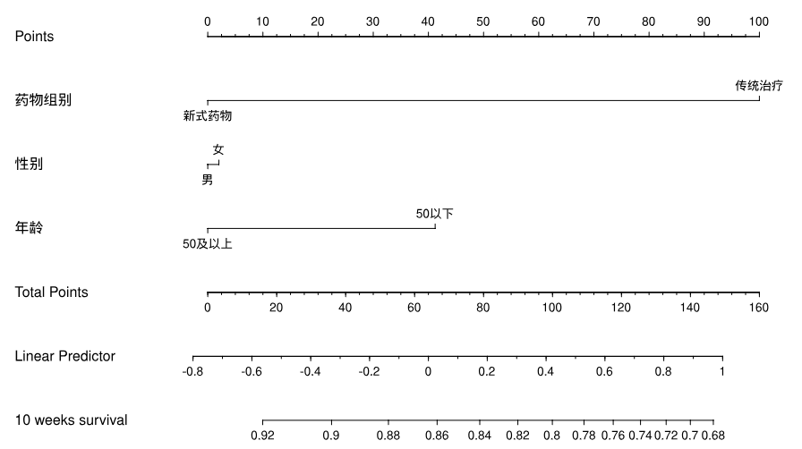 当前使用Cox回归研究药物对于疗效的影响作用,并且将性别和年龄纳入考虑范畴中,并希望生成列线图来直观展示预测情况。