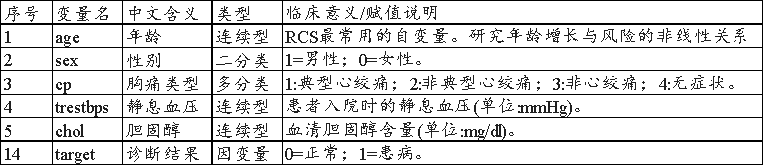 数据涉及年龄,性别,胸痛类型,静息血压,胆固醇水平和诊断情况。预期年龄与是否患心脏病之间具有非线性关系。而且希望性别、静息血压和胆固醇这3项作为协变量一并纳入RCS模型中。