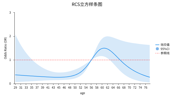 本次分析时由于因变量为0/1变量,因此选择二元logistic回归,并且默认RCS节点个数为4,并且以自变量年龄的中位数作用为基准点。