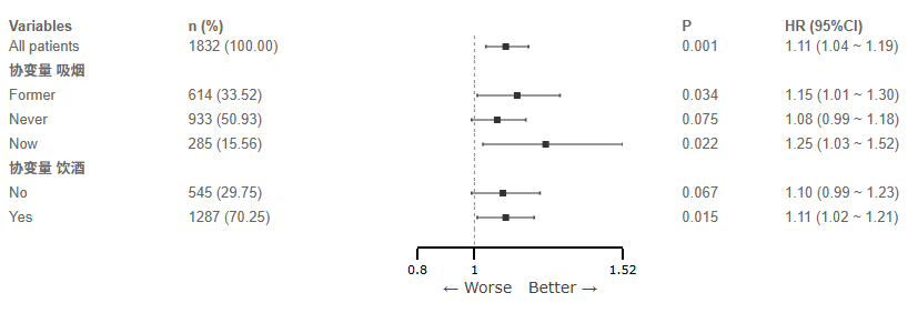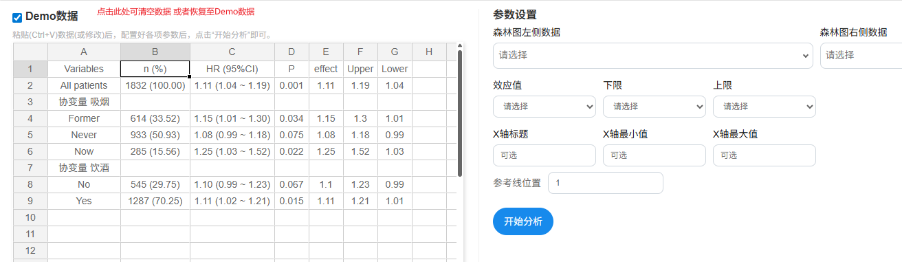 当前Demo数据时,Variables,n(%)是基本信息,因此其在森林图的左侧,HR(95% CI),P值为结论信息,建议配置在森林图的右侧。森林图时效应值效应值(如 OR、HR 或 RR)代表方块中心,下限与上限共同决定横线的跨度,分别配置好该3项后。点击‘开始分析’即可。至于X轴标题,X轴最小值/最大值,参考线位置,以研究者实际情况为准即可,配置参数如下图所示: