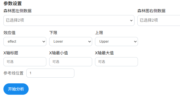 提示:森林图左侧数据和森林图右侧数据,均可留空,也可选择多项,其展示按照选入的顺序依次在森林图中展示出来。