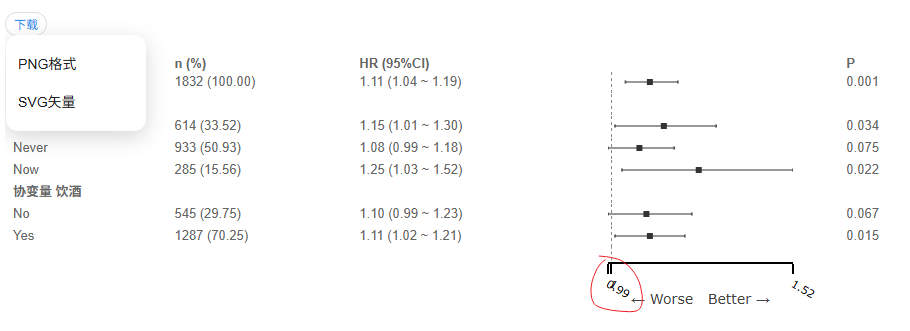 SPSSAU共支持PNG格式和SVG矢量图下载森林图。与此同时,图中横坐标数字有一定重叠,此时可修改X轴最小值或者X轴最大值进行优化,比如将X轴最小值设定为0.8,此时得到更整洁的森林图如下: